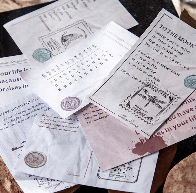 便箋としても、コラージュ素材としても、手帳デコ、スケジュール帳、日記帳、ガイドブック、封筒、小袋やお手紙のコラージュや、贈り物、プレゼントのラッピング、手作りお菓子や小物の包装、空箱などどこでも使え頂けます。また、シールやスタンプでアレンジ自在です。