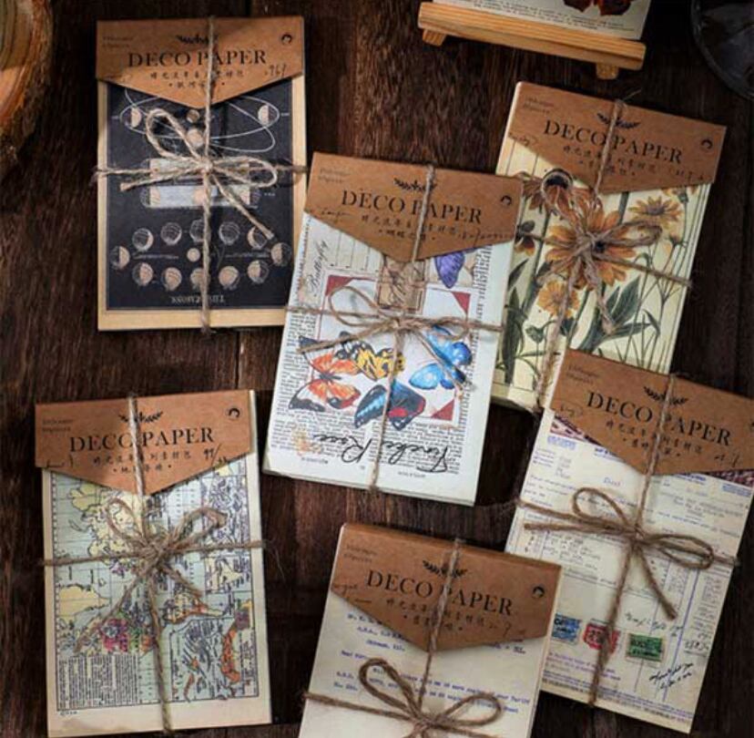 便箋としても、コラージュ素材としても、手帳デコ、スケジュール帳、日記帳、ガイドブック、封筒、小袋やお手紙のコラージュや、贈り物、プレゼントのラッピング、手作りお菓子や小物の包装、空箱などどこでも使え頂けます。また、シールやスタンプでアレンジ自在です。